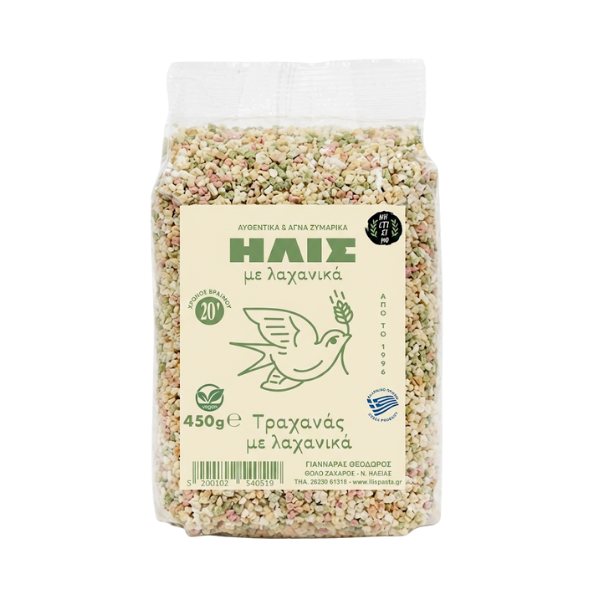 Le Trahana est une pâte traditionnelle granuleuse, élaborée ici avec des légumes frais pétris directement avec le blé. C’est un ingrédient réconfortant, idéal pour préparer des soupes onctueuses ou des plats mijotés riches en saveurs.